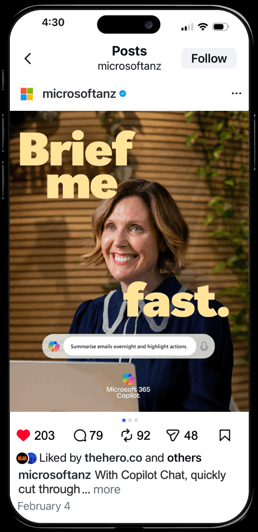 HERO repositioned Microsoft’s AUNZ social channels, from LinkedIn to Instagram, to product‑led broadcasting to a human‑centred, always‑on ecosystem. The work focuses on real people, real use cases and real outcomes. Customer stories were reframed to demonstrate tangible impact, while brand content highlighted Microsoft’s people, culture and partnerships, positioning the company as a community of innovators rather than a distant corporation.